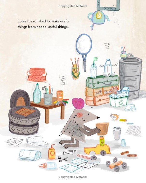 Louie the rat loves turning not-so-useful things into ingenious inventions, but none of the other rats in town seem to appreciate his odd, often ineffective gadgets. One day, Louie notices his fellow rats wearing some not-so-useful hats: huge hats that don't fit through doorways, heavy hats that are difficult to walk in, and ridiculous hats that make it impossible to see. Inspired, Louie decides to make some useful hats for the town. From his never-ending supply of discarded things, he makes wool hats for warmth, wide-brimmed hats for shade, and hard hats for safety.