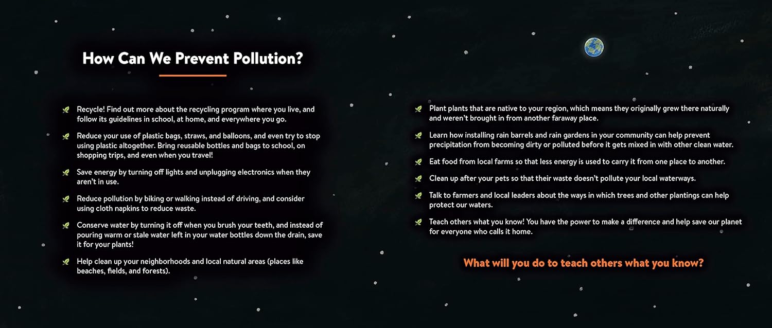 And on the story goes: The planet we call home has mountains that stretch from the earth, and those mountains have streams that swell in the sun, and those streams lead to rivers that meander by towns, and on and on--all interconnected and all dependent on one another. And throughout it all is us, the people who call this planet home, and who care for its many wonders and help keep it beautiful and vibrant for generations to come.