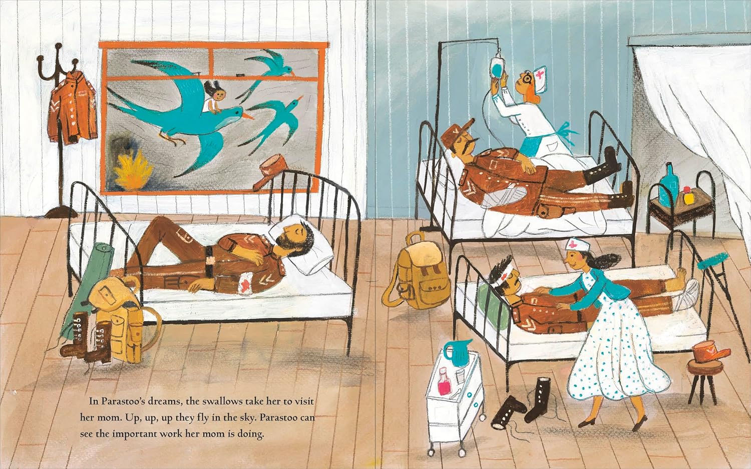 Parastoo loves the colors that make up her world, and especially loves the blue swallows in the tree outside her window. She's sad when they fly south for the winter--and this year is hard because her mom has to go away for a while, too. Fortunately, her grandparents take great care of her, and she continues to find joy in the wonders of each season. But she longs for spring, when her mother will return just like the swallows.