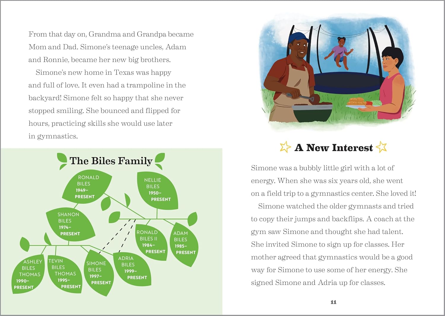- Independent reading--This Simone Biles biography is broken down into short chapters and simple language so kids 6 to 9 can read and learn on their own.