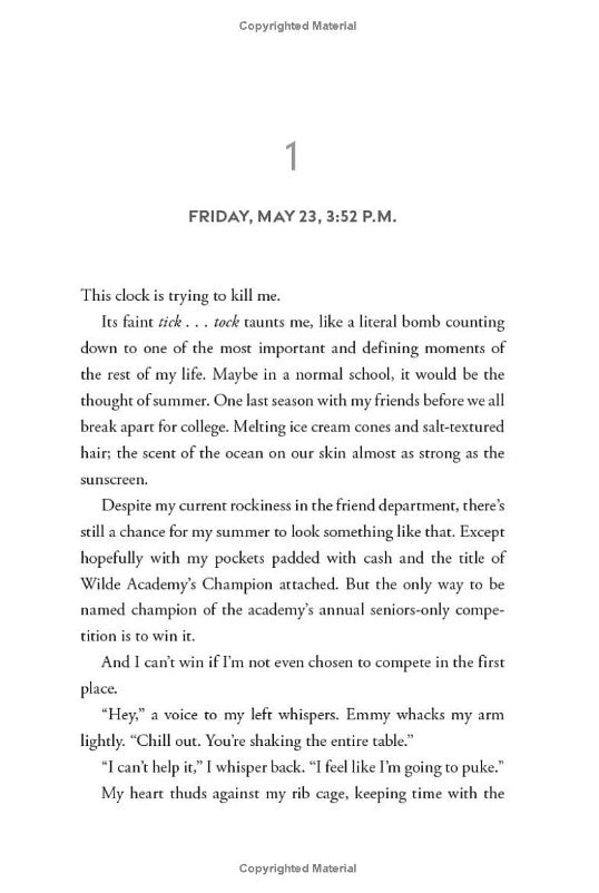 "Chloe Gatti will do whatever it takes to win her elite boarding school's annual competition, the Wilde Trials. In the two weeks leading up to graduation from Wilde Academy, a dozen seniors are chosen to compete in a series of seven ultimate physical and mental tests, and the winner will take home over half a million dollars--money that Chloe needs to help her sick sister.