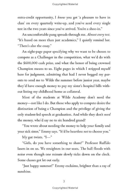 But the competition is fierce and includes her brooding ex-boyfriend, Hayes Stratford, whose brother was the only student to die during the trials a few years ago. When someone starts blackmailing Chloe during the competition, she's forced to strike a deal with Hayes--if he helps her discover who is sabotaging her, she'll help him solve the mystery his brother left behind.