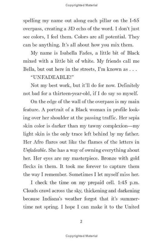 Bella "Unfadeable" Fades is determined to stay out of trouble. A wiser-than-her-years graffiti artist known for tagging walls and bridges in her Indianapolis neighborhood, the Land, Bella plans to spend her summer break laying low and steering clear of anyone who might tip off to social services that she's living on her own.
