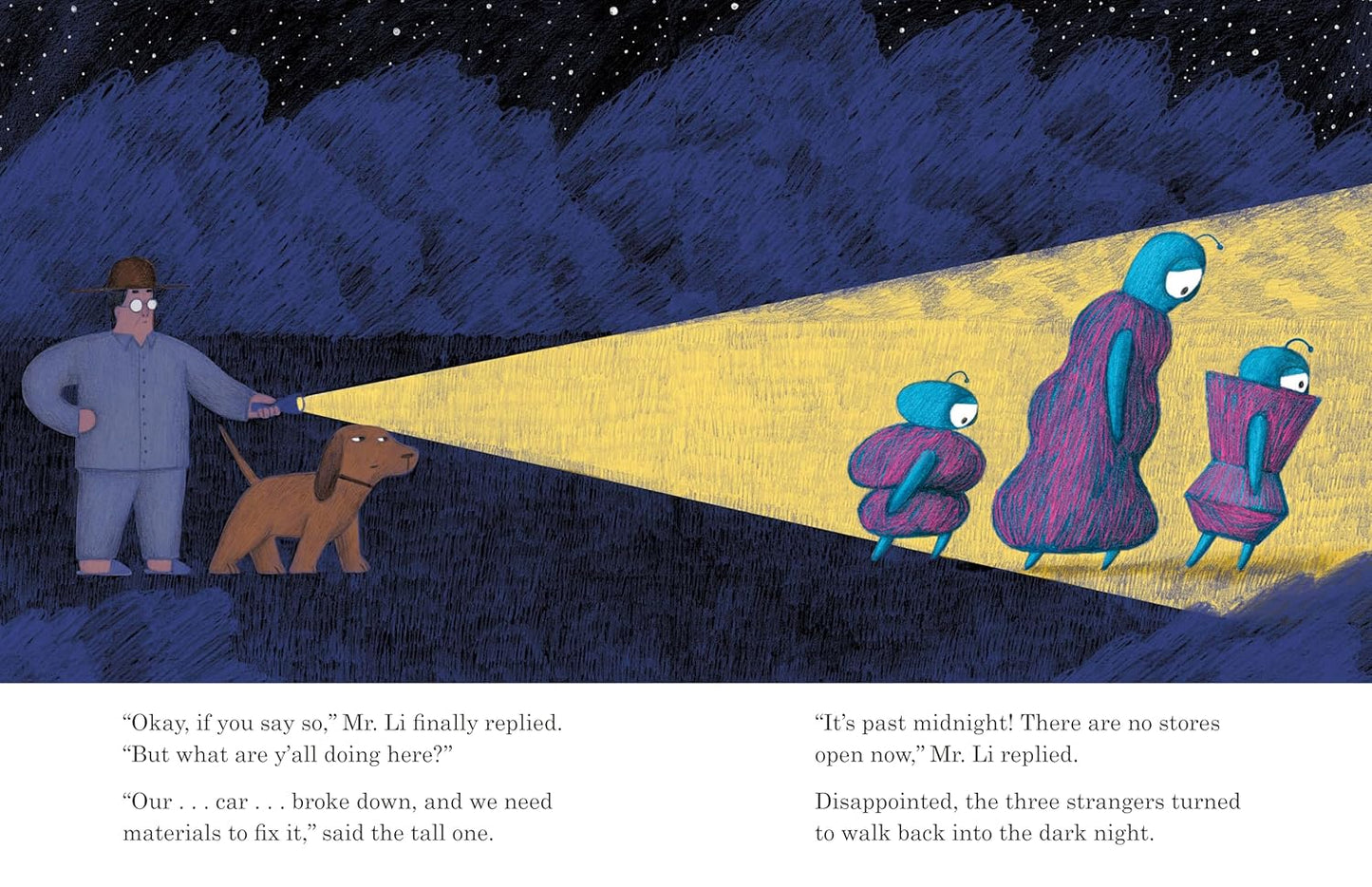 When three mysterious visitors from "Europe" crash-land in Mr. Li's field, he does what any good host would: he invites them back to his farmhouse and offers to help fix up their "car". No, there's nothing strange about these guests at all. Just like other humans, they "make business", "play sportsball" and "wear hat". As the townsfolk also come to the aid of the visitors and the gathering turns into a little party, interplanetary relations reach an all-time high.