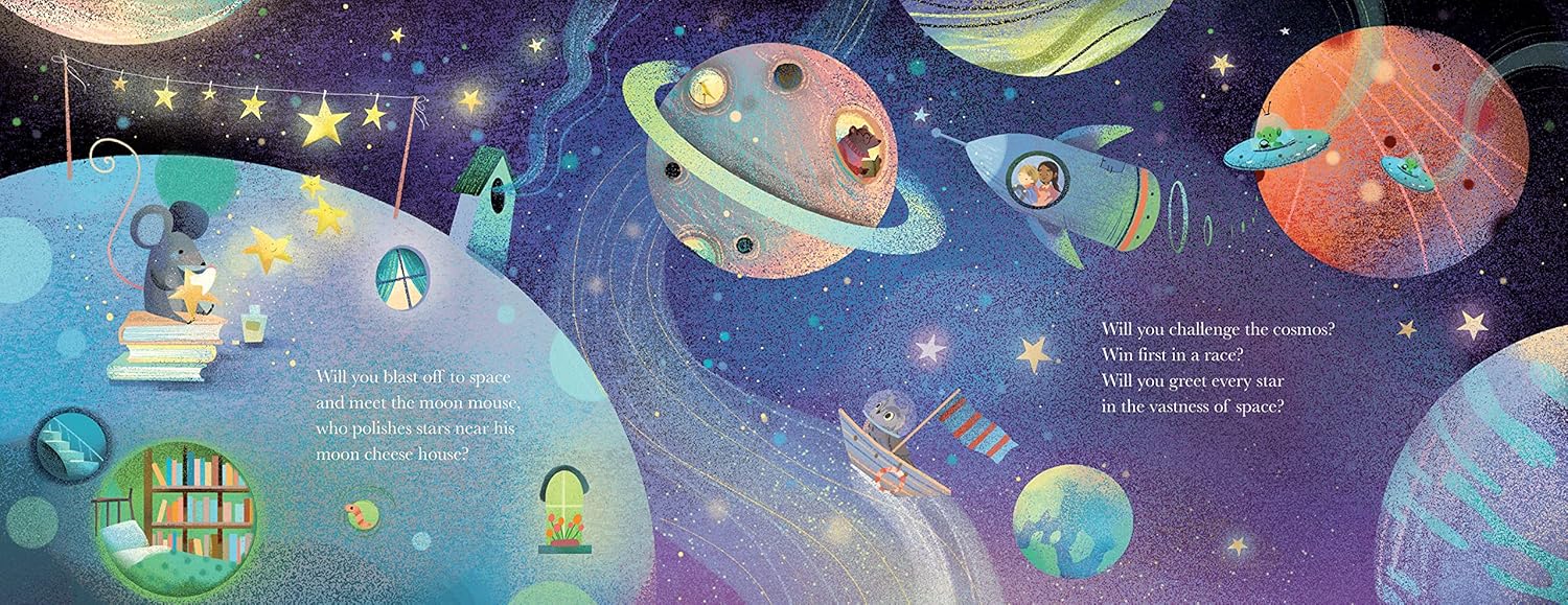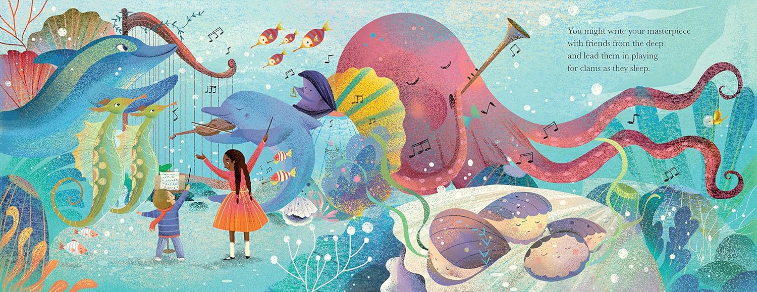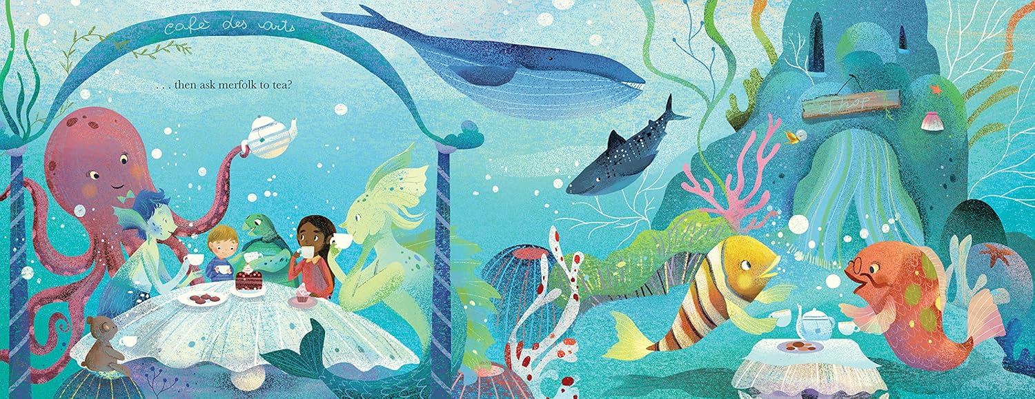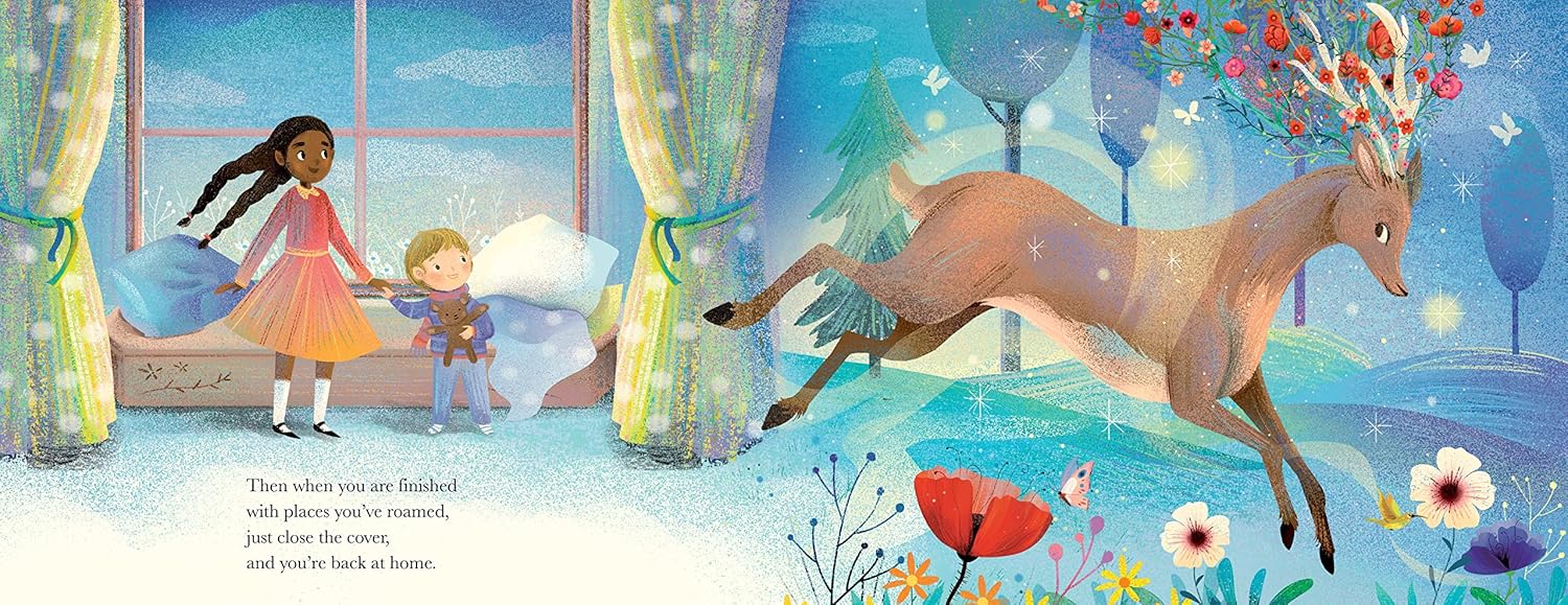 "Two children dine with mermaids, swashbuckle with pirates, and ride on the shoulders of a giant in this beautiful tale about the transportive power of reading. The dreamlike illustrations use a broad palette of bright colors and wispy textures to spark children's imaginations, encouraging them to crack open a book and enter a world of winged dragons, musical sea creatures, and mice hanging stars on the moon."--ForeWord Reviews, starred review