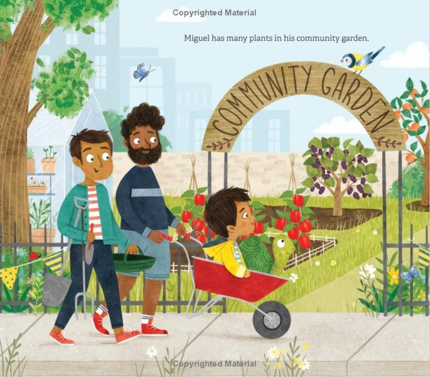 The second title in the Where in the Garden? picture book series stars a young Latino boy who visits his community garden with his two dads to explore the fruits and vegetables growing there. Playful text guides young readers to hunt for visual clues and compare and contrast the unique characteristics of sunflowers against apricots, spinach, mushrooms, and other produce that grows in Miguel's community garden."