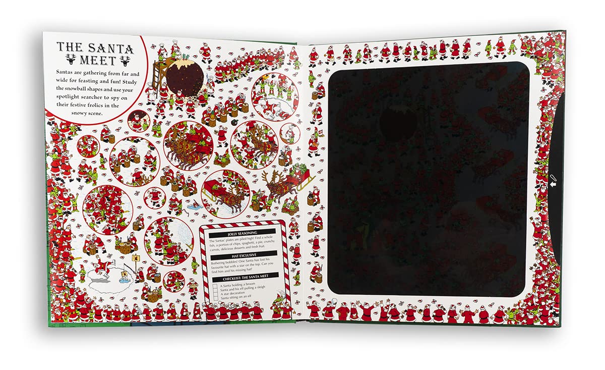 Shake your sleigh bells, pull on your holiday sweater, and join in the festive madness! These night-time scenes are bustling with Santas getting ready for Christmas Eve. With the help of a magic slider to light up one spot at a time, can you find some very specific Santas--like the one whose stocking is threadbare? Or the ones who are slimmer than most? And by the way, where are Waldo and all his friends--Wenda, Odlaw, Wizard Whitebeard, and Woof? Featuring super-challenging searches as well as puzzles and games, Santa's Spotlight Search promises many hours of merriment for seasoned Waldo fans and new followers alike.