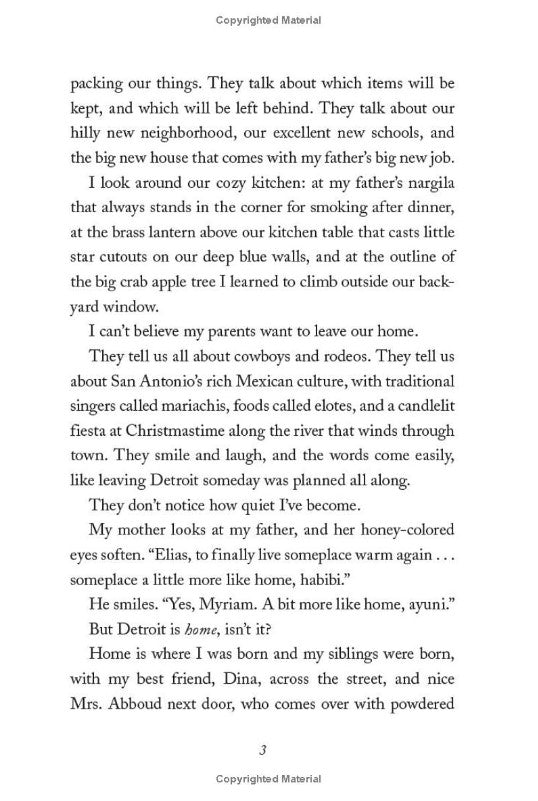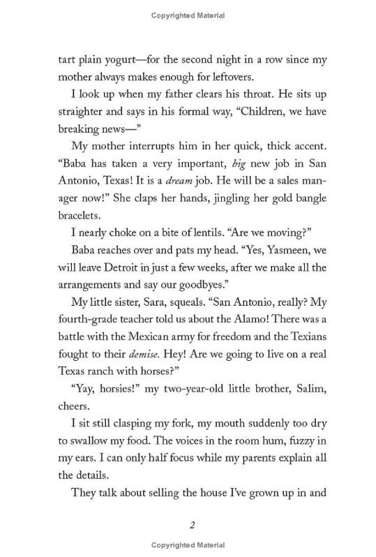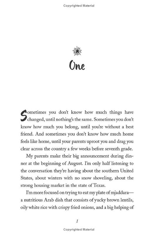 "When twelve-year-old Yasmeen Khoury moves with her family to San Antonio, all she wants to do is fit in. But her classmates in Texas are nothing like her friends in the predominantly Arab neighborhood back in Detroit where she grew up. Almost immediately, Yasmeen feels like the odd girl out, and as she faces middle school mean girls and tries to make new friends, she feels more alone than ever before.