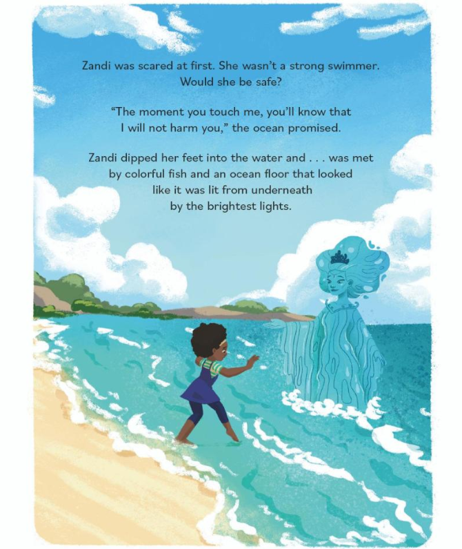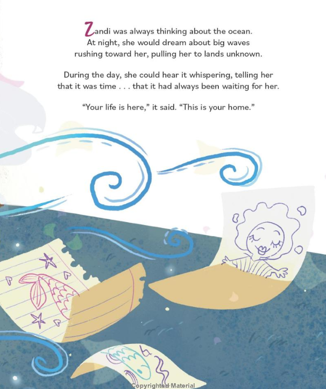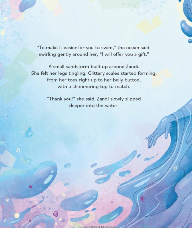 "Zandi was always thinking and dreaming about the ocean. Then, one special day, the ocean calls for her. Zandi tentatively approaches the water--and that's when her adventure begins! She soon finds herself transformed into a mermaid and on an unforgettable underwater journey, where she hears the song of the ocean."